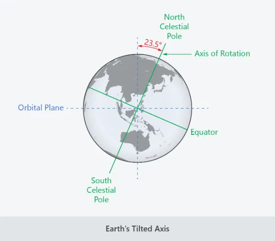 But Earth’s spinning axis is actually tilted. We are on an angle of about 23.5 degrees away from the orbital plane, the imaginary line that we follow as we circle the Sun.