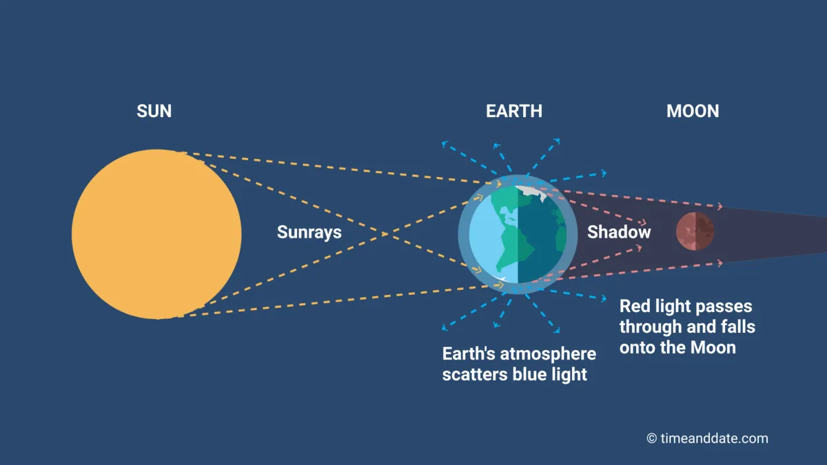 During a total lunar eclipse, Earth’s atmosphere scatters the blue light away from the Moon. Light in the red spectrum then falls on the Moon making it appear red. This is known as a Blood Moon.